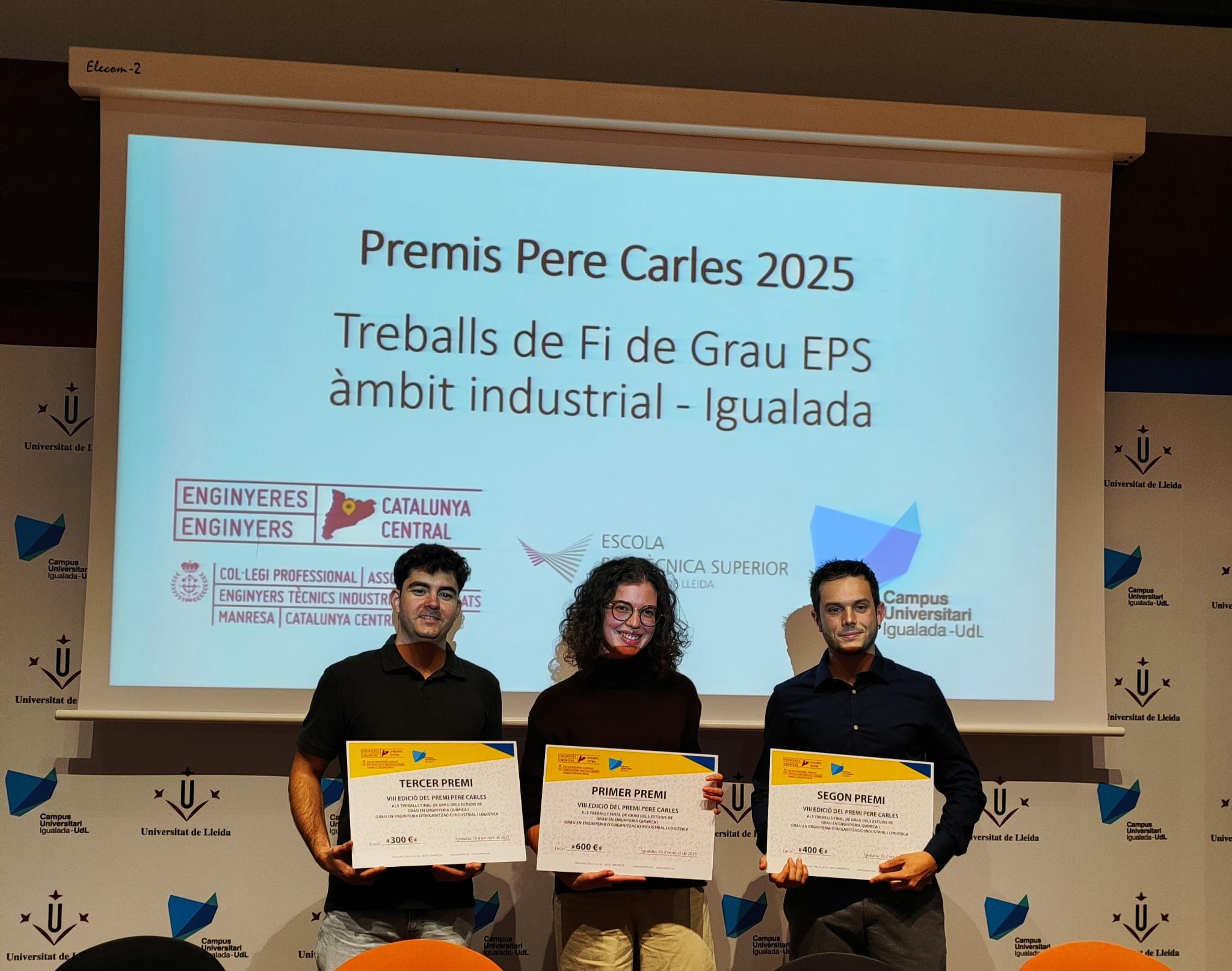 Descarregar PdfEl dilluns 20 d’octubre, l’edifici Pla de la Massa del Campus Universitari Igualada-UdL va acollir l’acte de lliurament dels Premis Pere Carles 2025, en la seva vuitena edició, que reconeixen els millors Treballs de Final de Grau (TFG) dels Graus de la branca d’Enginyeria Industrial de l’EPS, concretament del Grau en Enginyeria en Organització Industrial i Logística i del Grau en Enginyeria Química.